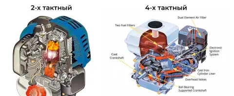 Двухтактный двигатель компактный и лёгкий. Подходит для редкого использования, но быстрее изнашивается, шумнее и расходует больше топлива.